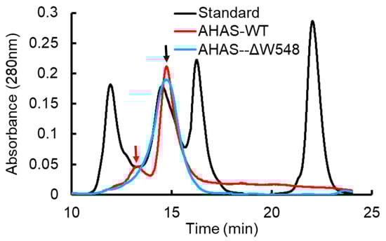 Gel filtration chromatography analysis of purified AHAS. AHAS-WT and AHAS-ΔW548 are shown as red and blue traces, respectively. The black trace is the molecular weight standard. From left to right, the molecular weights of the standards were 670, 158, 44 and 1.35 kD. The dimer peak (128 kDa) and tetramer peak (256 kDa) are indicated separately by the black arrow and red arrow.