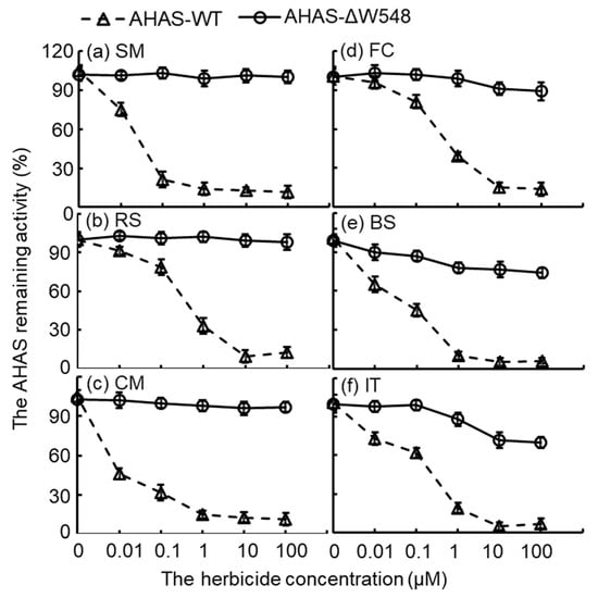 Bioassay curves of AHAS activities in the presence of six herbicides. AHAS-WT was inactive when an herbicide was more than 10 μM. AHAS-ΔW548 remained active at high concentrations of herbicides. Panels of (a–f) displayed the AHAS remaining activities in solutions of different herbicides: (a) sulfometuron-methyl (SM), (b) rimsulfuron (RS), (c) chlorimuron-methyl (CM), (d) flucarbazone-sodium (FC), (e) bispyribac-sodium (BS), and (f) imazethapyr (IT). Error bars represented the errors from triplicate measurements. Triangles are AHAS-WT, and circles are AHAS-ΔW548.