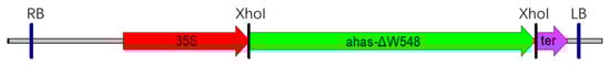 Diagram of T-DNA cassette for rice transformation. The ahas-ΔW548 gene replaced the hygromycin resistant gene and served as a selection marker. This gene was driven by a 35S promoter. RB and LB: right and left border of T-DNA; 35S: 35S promoter of the CaMV; ter: terminator of the CaMV.