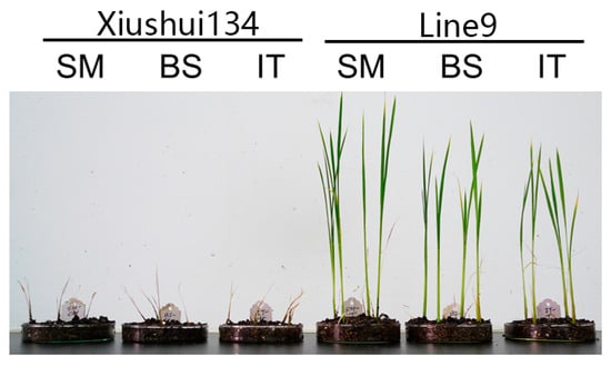Image showing rice plants with herbicide treatment. The plants were treated with 0.25 g/L SM, 0.8 g/L BS or 2.2 g/L IT at the seedling stage. After two weeks, the Xiushui134 plants withered, while the Line9 plants survived with the herbicide treatment.