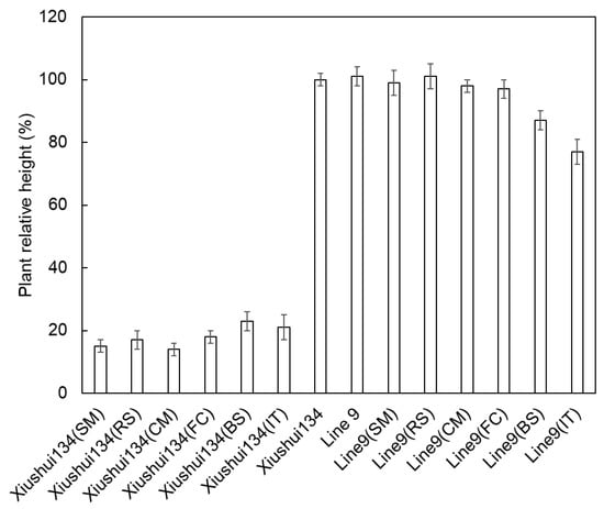 Plant relative height of Xiushui134 and Line9 at the seedling stage. The Xiushui134 plants were killed with herbicide treatments, and the relative heights were around 20%. The Line9 plants grew well with SU herbicide treatments. The growth of Line9 was inhibited by a PYB (BS) and IMI (IT) herbicides. Error bars represent the errors from multiple measurements.