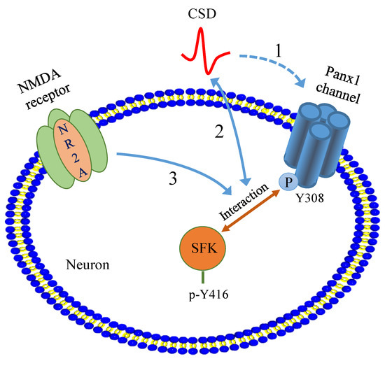 Bu, F.; Nie, L.; Quinn, J.P.; Wang, M. Sarcoma Family Kinase-Dependent Pannexin-1 Activation after Cortical Spreading Depression Is Mediated by NR2A-Containing Receptors. Int. J. Mol. Sci. 2020, 21, 1269. https://doi.org/10.3390/ijms21041269
