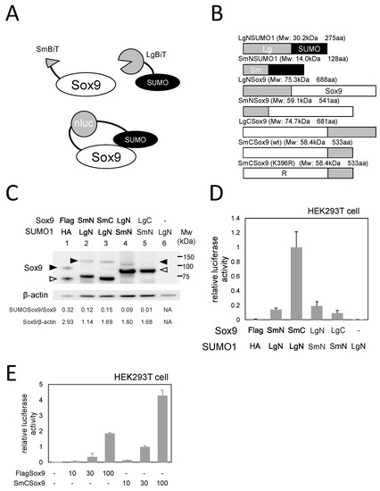 We found that the SUMOylation level of SmCSox9/LgNSUMO1 and SmNSox9/LgNSUMO1 was similar on Western blotting while examining the combinations of LgBiT/SmBiT conjugated SUMO1 and Sox9, but that the luciferase activity in the former was much higher than that in the latter (Figure 1). These results indicate that the reporter activity depends on not only the degree of SUMOylation, but also the mutual position of the NanoBiT fragments.