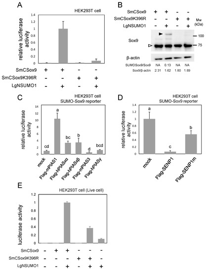 SUMO-Sox9 reporter activity in HEK293T cells. (A) A luciferase assay to examine the SUMOylation dependency of SUMO-Sox9 reporter. Bars indicate the mean value of triplicate wells. Error bars indicate the standard deviation. (B) Western blotting of the cell extract prepared as those of (A). White arrowhead indicates Sox9. Black arrowhead indicates SUMOylated Sox9. β-actin served as a loading control. The ratios of SUMOylated/non-SUMOylated Sox9 and non-SUMOylated Sox9/ß-actin are shown at the bottom. NA indicates that one or both protein bands were not detected. (C) A luciferase assay to examine whether or not the SUMO-Sox9 reporter activity could be upregulated with the promotion of Sox9 SUMOylation. Bars indicate the mean value of triplicate wells. Error bars indicate the standard deviation. The mean values sharing a letter did not differ to a statistically significant extent (p ≥ 0.05, Tukey’s HSD test). (D) A luciferase assay to examine whether or not the SUMO-Sox9 reporter activity could be downregulated with Sox9 deSUMOylation. The bars indicate the mean value of triplicate wells. Error bars indicate the standard deviation. The mean values sharing a letter did not differ to a statistically significant extent (p ≥ 0.05, Tukey’s HSD test). (E) A luciferase assay to detect the SUMO-Sox9 reporter activity from live cells. Bars indicate the mean value of triplicate wells. Error bars indicate the standard deviation. All experiments were repeated at least twice, and representative results are shown.