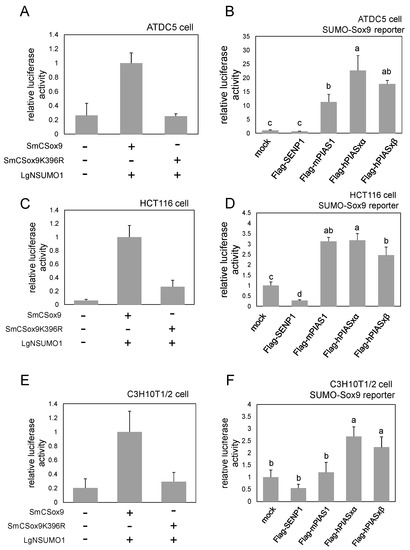 We expressed this reporter in several other cell lines that are more biologically relevant for the Sox9 activity to examine whether or not SUMO-Sox9 reporter can be used in other cell lines. Namely, ATDC5 cells that have the potential to differentiate into chondrocytes, HCT116 cells derived from colon cancer, and C3H10T1/2 cells established from embryonic fibroblasts were examined. As in HEK293T cells, SUMO-Sox9 reporter showed luciferase activity in a K396-dependent manner in all three cell types (Figure 3A,C,E). In addition, the co-expression of PIAS proteins elevated the reporter activity (Figure 3B,D,F). The co-expression of SENP1 repressed the reporter activity in HCT116 cells, but it had less effect in ATDC5 and C3H10T1/2 cells (Figure 3B,D,F). In summary, our results showed that SUMO-Sox9 reporter could also be applied to other cell types and implied that the effect of Sox9 SUMOylation/deSUMOylation enzymes might differ among cell types, possibly depending on the endogenous SUMOylation level or other factors.