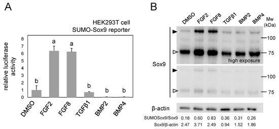 FGF signaling increases SUMOylated Sox9. (A) A luciferase assay for detecting the effects of cytokine treatments on Sox9 SUMOylation. HEK293T cells were transfected with SUMO-Sox9 reporter and treated with cytokines for 18 h, and the luciferase activity was then measured. Bars indicate the mean value of triplicate wells. Error bars indicate the standard deviation. The mean values sharing a letter did not differ to a statistically significant extent (p ≥ 0.05, Tukey’s HSD test). (B) Western blotting of the cell extract prepared as those in (A). Sox9 blots with shorter exposure (middle panel) and longer exposure (upper panel) are shown. β-actin served as a loading control. White arrowhead indicates Sox9, and black arrowhead indicates SUMOylated Sox9. The ratios of SUMOylated/non-SUMOylated Sox9 and non-SUMOylated Sox9/ß-actin are shown at the bottom. All experiments were repeated at least twice, and representative results are shown.