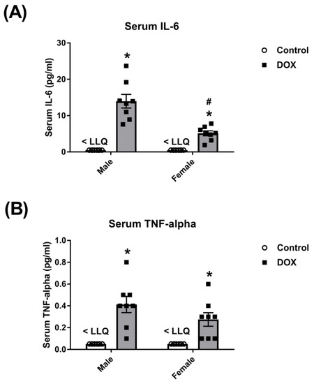We and others have demonstrated significant sex-related differences in DOX-induced cardiotoxicity and nephrotoxicity [11,22,24,25]. Nevertheless, sex-related differences in DOX-induced systemic inflammation have not been previously reported. Therefore, we determined the effect of acute DOX administration on serum level of key inflammatory mediators, interleukin 6 (IL-6) and tumor necrosis factor-alpha (TNF-alpha), in adult male and female C57Bl/6 mice 24 h post-treatment. Acute DOX administration (20 mg/kg) elicited a systemic inflammatory response and caused a significantly higher increase in the serum level of IL-6 in male than in female mice (14 pg/mL in DOX-treated males vs. 5 pg/mL in DOX-treated females). Although the TNF-alpha serum level was higher in DOX-treated male than female mice (0.4 pg/mL in DOX-treated males vs. 0.3 pg/mL in DOX-treated females), this difference was not statistically significant. The serum levels of IL-6 and TNF-alpha were below the lower limit of quantification (LLQ) in control male and female mice (Figure 1).