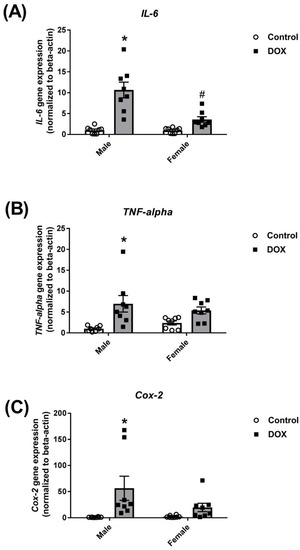 Effect of DOX treatment on the gene expression of inflammatory markers in the liver. Livers were collected from male or female C57Bl/6 mice 24 h following the administration of a single intraperitoneal injection of 20 mg/kg DOX or saline, and total RNA was isolated (n = 8 per group). Gene expression of (A) IL-6, (B) TNF-alpha, or (C) Cox-2 was determined by real-time PCR. Results were normalized to beta-actin and are expressed relative to the male control. Data are presented as the mean ± SEM. * p < 0.05, compared to control mice of the same sex; # p < 0.05, compared to male DOX-treated mice.