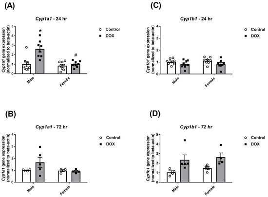 Effect of DOX treatment on the gene expression of the Cyp1 family in the liver. Livers were collected from male or female C57Bl/6 mice 24 h (n = 8 per group) or 72 h (n = 4–5 per group) following the administration of a single intraperitoneal injection of 20 mg/kg DOX or saline, and total RNA was isolated. Gene expression of Cyp1a1 was determined by real-time PCR in samples collected (A) 24 or (B) 72 h following DOX treatment. Gene expression of Cyp1b1 in samples collected (C) 24 or (D) 72 h following DOX treatment. Results were normalized to beta-actin and are expressed relative to the male control. Data are presented as the mean ± SEM. * p < 0.05, compared to control mice of the same sex; # p < 0.05, compared to male DOX-treated mice.