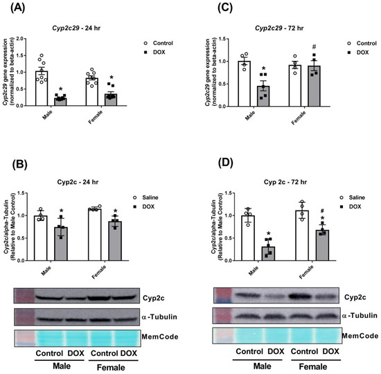 Effect of DOX treatment on the expression of the Cyp2c sub-family in the liver. Livers were collected from male or female C57Bl/6 mice 24 or 72 h following the administration of a single intraperitoneal injection of 20 mg/kg DOX or saline, and total proteins and RNA were isolated. (A) Gene expression of Cyp2c29 was determined by real-time PCR (n = 8 per group) and (B) protein levels of total Cyp2c were determined by western blotting (n = 4 per group) in samples collected 24 h following DOX treatment. (C) Gene expression of Cyp2c29 (n = 4–5 per group) and (D) protein levels of Cyp2c (n = 4–5 per group) were determined in samples collected 72 h following DOX treatment. PCR results were normalized to beta-actin, and protein expression was normalized to alpha-tubulin. Results of all groups are expressed relative to the male control. Data are presented as the mean ± SEM. * p < 0.05, compared to control mice of the same sex; # p < 0.05, compared to male DOX-treated mice.
