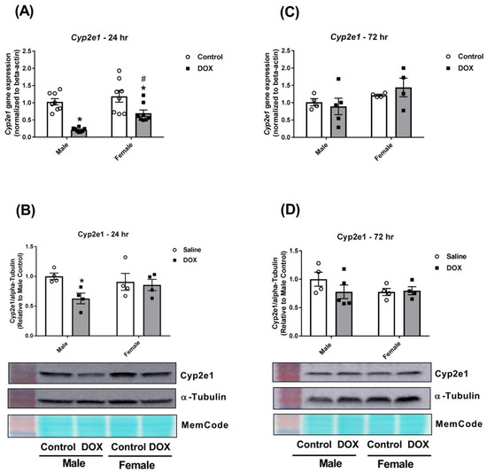 Effect of DOX treatment on the expression of Cyp2e1 in the liver. Livers were collected from male or female C57Bl/6 mice 24 or 72 h following the administration of a single intraperitoneal injection of 20 mg/kg DOX or saline, and total proteins and RNA were isolated. (A) Gene expression of Cyp2e1 was determined by real-time PCR (n = 8 per group), and (B) protein levels of Cyp2e1 were determined by western blotting (n = 4 per group) in samples collected 24 h following DOX treatment. (C) Gene expression of Cyp2e1 (n = 4–5 per group) and (D) protein levels of Cyp2e1 (n = 4–5 per group) were determined in samples collected 72 h following DOX treatment. PCR results were normalized to beta-actin, and protein expression was normalized to alpha-tubulin. Results of all groups are expressed relative to the male control. Data are presented as the mean ± SEM. * p < 0.05, compared to control mice of the same sex; # p < 0.05, compared to male DOX-treated mice.