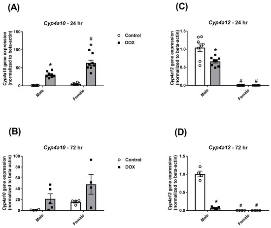 DOX caused a significant 30-fold induction in Cyp4a10 gene expression in male mice 24 h after administration (Figure 6A). Basal Cyp4a10 gene expression was 5 times higher in females than males and was further induced 12-fold by DOX administration to be 60 times higher than its value in the control-male group (Figure 6A). Similar results were observed 72 h following acute DOX administration; nevertheless, the differences did not reach statistical significance (Figure 6B). Cyp4a12 was expressed in male mice at much higher levels than in female mice (Figure 6C,D), confirming that Cyp4a12 is a male-specific isoform as previously reported [24]. Interestingly, DOX caused a significant 35% and 90% inhibition of Cyp4a12 gene expression after 24 h and 72 h of administration, respectively, in male mice (Figure 6C,D).