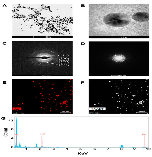 Characterization of Cudrania tricuspidata root (CTR)-gold nanoparticles (GNPs). High resolution transmission electron microscopy (HR-TEM) images at (A) low magnification (scale bar, 200 nm), (B) high magnification (scale bar, 10 nm), (C) selected area electron diffraction (SAED) pattern, (D) fast Fourier transform (FFT) pattern (E,F) high-angle annular dark field (HAADF) image, and (G) energy dispersive spectroscopy (EDS) analysis of CTR-GNPs.