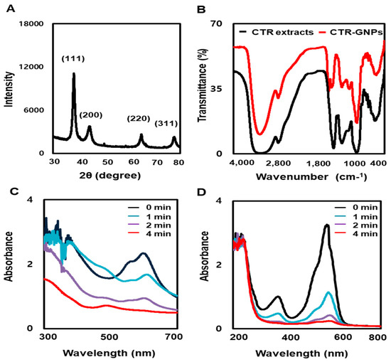 To examine the crystallization pattern of the gold particles in the CTR-GNPs, X-ray diffraction (XRD) measurement was recorded, as shown in Figure 2A. The main peaks were obtained at (111), (200), (220), and (311), corresponding to the Bragg’s reflections with 2θ values (30–80°) of 38.21°, 44.39°, 64.73°, and 77.60°, respectively. The peak of the XRD spectrum confirms that the highly purified GNPs are composed of crystalline gold. The GNP-based plants involve biocompatible materials that can act as functionalizing ligands under physiological situations, creating GNPs that are more appropriate for biomedical applications. CTR extracts also provide possible functional groups, which can attach onto the surface of the CTR-GNPs and form a capping and efficient stabilization. In this study, the FT-IR spectra were obtained to acquire further information about the presence of bioactive components in the capping layer of the CTR-GNPs. The FT-IR spectra of the CTR extracts and corresponding CTR-GNPs indicated extensive mutual resemblance. In particular, the prominent peaks of the CTR corresponding CTR-GNPs were characterized by −OH stretching at 3372.01 cm−1. −CH stretching was observed at 2930.25 cm−1, and we also observed a peak at 1592.45 cm−1 corresponding to the C−C stretch of aromatics (Figure 2B). On the basis of these observations, we suggested that the reduction, capsulation, and stabilization of CTR-GNPs were due to the functional groups present in the CTR extract, such as phenols, flavonoids, and proteins. The reduction of methylene blue and rhodamine B was studied using sodium borohydride in the presence of CTR-GNPs and monitored by a UV-Vis spectrophotometer. Characteristic absorption peaks were observed corresponding to pure methylene blue and rhodamine B at 665 and 555 nm, respectively. In the presence of CTR-GNPs as a catalyst, the deep blue (methylene blue) and pink-red (rhodamine B) colors gradually decreased and finally disappeared. In Figure 2C,D, the UV-vis spectra revealed that the peak intensity completely disappeared within 4 min of addition of CTR-GNPs.