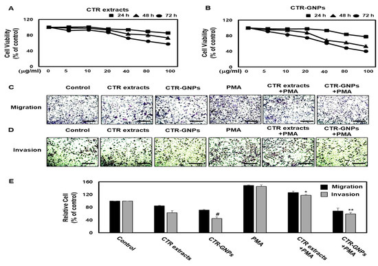 To investigate the effects of CTR-GNPs on the viability of human U87 glioblastoma cells, the cell counting kit-8 (CCK-8) assay was performed using CTR-GNPs at specific concentrations (0, 5, 10, 20, 40, 80, and 100 µg/mL) for 24, 48, and 72 h. We observed that the cell viability was significantly reduced by the CTR extract and the CTR-GNPs at doses over 80 µg/mL in human U87 glioblastoma cells compared with the control cells. However, treatment with the CTR extract or CTR-GNPs at concentrations of up to 40 µg/mL for 24 h did not significantly alter the cell viability in the human U87 glioblastoma cells. Therefore, for all subsequent experiments, the cells were treated with CTR extract or CTR-GNPs at a dose of 40 µg/mL (Figure 3A,B). We conducted a cell migration assay using U87 cells to assess whether CTR-GNPs could effectively inhibit the motility of the tumor cells. Human U87 glioblastoma cells showed high metastasis ability and the gap repopulated by cells was observed in a cell migration study [11]. As shown in Figure 3C,E, PMA-stimulated U87 cells had significantly increased migration ability over the control group, while treatment with CTR extracts and CTR-GNPs (40 µg/mL) inhibited the migration ability of PMA-stimulated U87 cells. Furthermore, a slight decrease in the migration ability was observed in the U87 cells that were treated with CTR extract or CTR-GNPs alone. Importantly, CTR-GNPs showed a higher inhibitory effect against the motility of U87 cells than the CTR extracts, with or without PMA treatment. The effect on the invasive ability was confirmed using the CytoSelect™ 24-Well Cell Invasion Assay kit. Consistent with the results from the migration assay using U87 cells, we observed an increase in the invasiveness of the cells treated with PMA, which could be inhibited by treatment with the CTR extract and CTR-GNPs. The results of invasion assay also showed that CTR-GMPs significantly decreased the number of invasive cells compared to the CTR extract at an equivalent concentration in PMA stimulated or non-stimulated cells (Figure 3D,E).