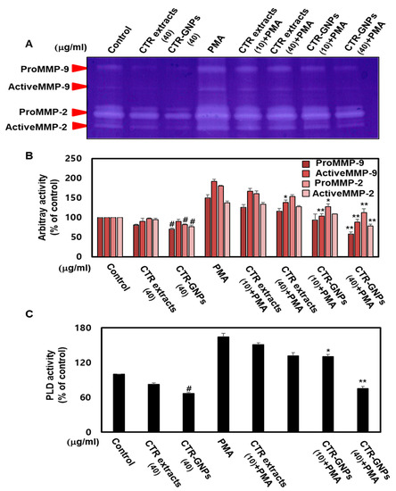 Accumulating evidence suggests that cell invasion and motility actions are the base characteristics of MMP-2/-9 and PLD [31]. To further understand the anti-invasive activity of CTR-GNPs on human U87 glioblastoma cells, we used gelatinase zymography to confirm the enzymatic activity of MMP-2/-9. The results showed that the enzymatic activity of MMP-2/-9 was significantly inhibited due to CTR-GNPs in PMA-stimulated cells. The CTR-GNPs showed high anti-MMP-2/-9 enzymatic activity as compared to CTR extract in PMA-stimulated groups as well as the non-stimulated group (Figure 4A,B). PLD activity in the tumor cells is one of the most important steps leading to tumor metastasis. Therefore, we further investigated the effect of the CTR extract and CTR-GNPs on the PLD activity of PMA-treated and untreated cells. CTR-GNPs were more effective in inhibiting the PLD activity than CTR, which shows that CTR-GNPs are more highly active than CTR extract (Figure 4C).