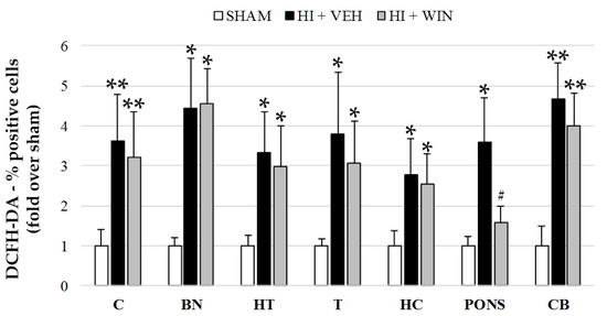 Figure 1 shows that ROS evaluation using the fluorochrome DCFH-DA revealed a significant (* p < 0.05 or ** p < 0.01 vs. sham) increase in its production after HI in all brain regions studied. While the percentage of positive cells for sham animals never exceeded 14.8%, HI raised these values to 53.8% for the cortex, with the rest of the brain regions ranging from 39.1 to 49.9%. Comparing HI with sham animals, this implies an increase of 3 to 5 times (Figure 1 and Figure 2). The administration of the CB agonist WIN solely reduced its production in pons (#p < 0.05 vs. HI+VEH), remaining elevated in the cortex, basal nuclei, hypothalamus, thalamus, hippocampus, and cerebellum.