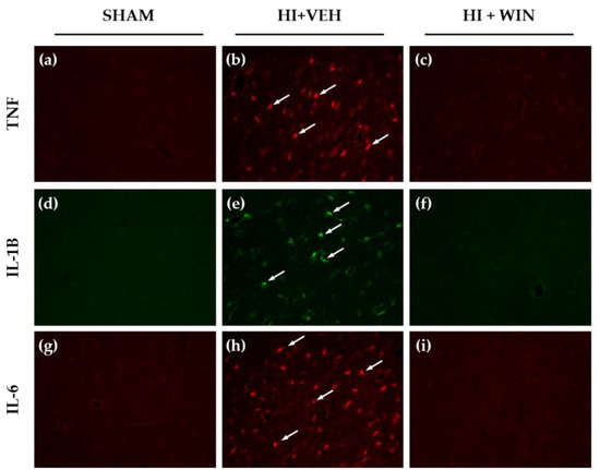 Figure 3 shows the histological assessment of the presence of TNF-α, IL-1β and IL-6. Sham brains did not display immunoreactivity for these cytokines (Figure 3a,d,g), whereas TNF-α (Figure 3b), IL-1β (Figure 3e), and IL-6 (Figure 3h) immunoreactivity was markedly increased after HI. Figure 3c,f,i show that animals receiving WIN treatment showed no signs of the presence of these cytokines.
