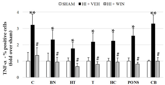 Figure 2 and Figure 4 show TNF-α production revealed by means of flow cytometry showing that the global increase in its expression was reduced after WIN administration. TNF-α levels for both sham and HI+WIN groups ranged between 6.5 and 9.4% for all brain regions; hypoxic–ischemic animals reached values of 21.74% positive cells for basal nuclei (* p < 0.05 vs. sham) or 24.13% for cerebellum (** p < 0.01 vs. sham). Globally, we showed a twofold increase for brain regions such as the hypothalamus, thalamus, and hippocampus and a threefold increase for the cortex and cerebellum (Figure 4), which decreased after WIN administration (#p < 0.05 vs. HI+VEH).