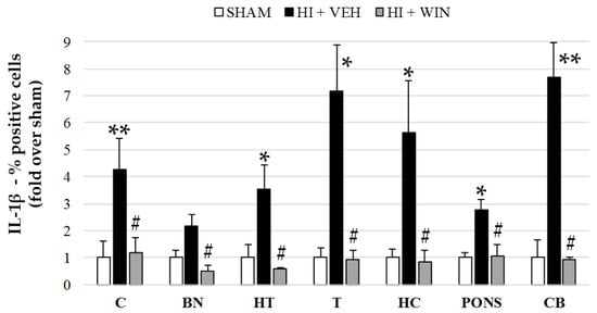 Figure 2 and Figure 5 show results for IL-1β analysis, where we can observe that non-asphyctic animals showed values ranging from 4.10 to 14.22%. As revealed by the HI group, HI generated a widespread and significant increase in IL-1β expression (** p < 0.01 for cortex, thalamus, and cerebellum; * p < 0.05 for basal nuclei, hypothalamus, hippocampus, and pons). Cerebral brain regions such as the thalamus and hippocampus showed an increase in IL-1β levels of 6–7 times, an effect completely abolished by WIN (#p < 0.05 vs. HI+VEH), displaying values similar to those of the sham group (Figure 5).