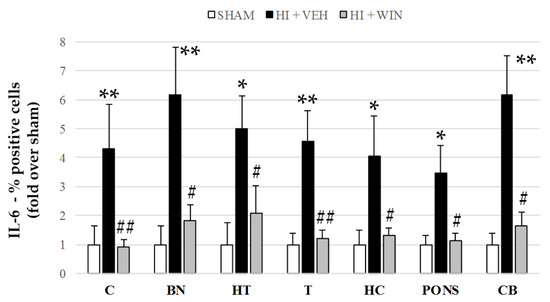 In the same manner as for TNF-α and IL-1β, but to a lesser extent, Figure 2 and Figure 6 show that IL-6 showed a significant increase in its production after HI in all brain regions studied. The percentage of positive cells for sham animals never exceeds 5%, but HI increased these values to 18.2% for the cerebellum, with the rest of the brain regions ranging from 10 and 15%. This increase was reduced by the administration of the CB agonist WIN (#p < 0.05 vs. HI+VEH; (##p < 0.01 vs. HI+VEH; Figure 6).