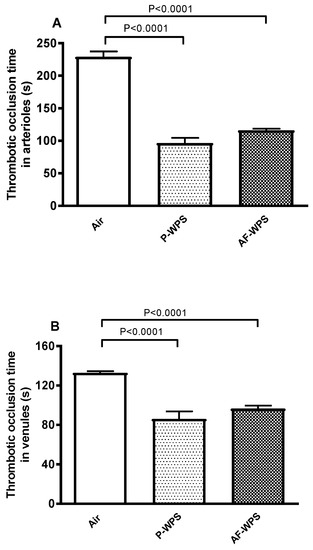 In vivo pial arteriolar and venular thrombogenesis was assessed at the end of the 1 mo exposure period to either P-WPS or AF-WPS or air, according to a previously described technique [13,18].