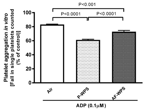 Figure 3 illustrates the evaluation of platelet aggregation in whole blood in vitro. Following the incubation with adenosine diphosphate (ADP), there was a significant fall in single platelets, indicating the occurrence of platelet aggregation in whole blood of mice exposed to either P-WPS (P < 0.0001) or AF-WPS (P < 0.001) compared with the group of mice exposed to air only. Moreover, there was a statistical difference between P-WPS and AF-WPS groups (P < 0.0001).