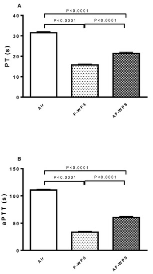 In separate animals, at the end of the one-month exposure period to P-WPS or AF-WPS or air, blood was withdrawn from mice, and PT and aPTT were measured according to a previously described technique [13,18].