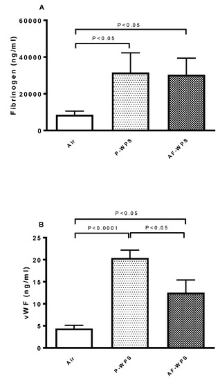 Figure 5 shows the concentration of fibrinogen, which is known to promote thrombosis, and vWF, which mirrors blood vessel reactivity. The exposure to either P-WPS or AF-WPS caused a significant increase in the concentrations of fibrinogen and vWF. Moreover, for vWF, there was a statistical difference between P-WPS and AF-WPS groups.