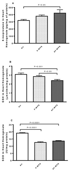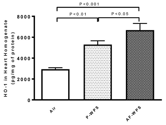 The estimation of HO-1, an Nrf2-regulated gene, which exerts an important role in the mitigation of oxidative stress and inflammation, is illustrated in Figure 11. The concentration of HO-1 was significantly increased in the heart homogenates of both P-WPS and AF-WPS groups compared with air-exposed group. Moreover, the effect seen in AF-group was significantly higher than that observed in P-WPS group.