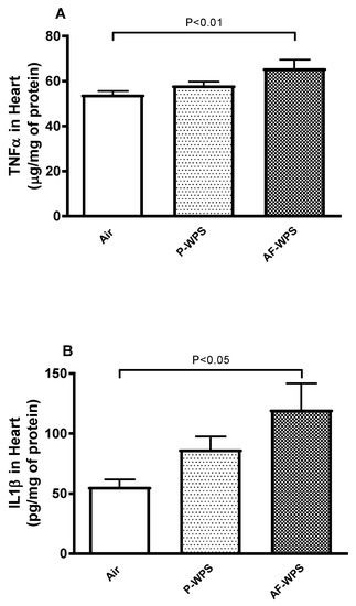 The quantification of cleaved caspase 3 in heart homogenates obtained from mice exposed to either air or P-WPS or AF-WPS were prepared as previously reported [13,18]. Cleaved caspase 3 was measured in air, P-WPS and AF-WPS groups with mouse (Asp175) DuoSet IC ELISA kit purchased from R&D systems (Minneapolis, MN, USA).