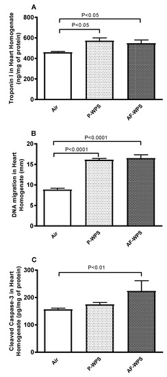Figure 8 displays the assessment of markers of myocardial injury (Troponin I), DNA damage and apopotosis (cleaved caspase-3). Figure 8A,B shows that exposure to either P-WPS or AF-WPS caused an increase in the concentration of troponin I (P < 0.05) in heart homogenates and induced DNA damage (P < 0.0001) measured by COMET assay. Figure 8C shows that the exposure to AF-WPS caused a significant increase in cleaved caspase-3 (P < 0.01). However, the increase of cleaved caspase-3 concentration induced by P-WPS inhalation was slight and failed to reach statistical significance (Figure 8C).