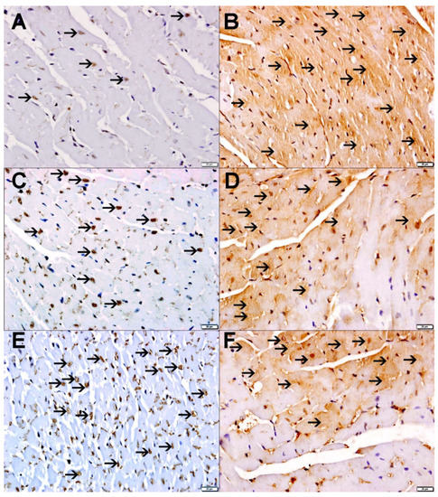 The immunohistochemical preparation and analysis of heart section for the detection of nuclear factor erythroid 2–related factor 2 (NRF-2) and SOD were performed using anti-NRF-2 (Rabbit Polyclonal, 1:100, Abcam, Burlingame, CA, USA) and anti-SOD (Rabbit Polyclonal, 1:300, Abcam, Burlingame, CA, USA) antibodies, as described before [35,52]. The immunohistochemical staining of the heart tissue was scored semi-quantitatively on a scale of 0–4 according to % of staining of heart muscles in 4 slides of each specimen, and each slide included 4 equal coronal slices of the heart. A score of 0 was given if the expression varied from 0% to 10%, 1 for 11% to 25%, 2 for 26% to 50%, 3 for 51% to 75% and 4 for over 75% [35,52].