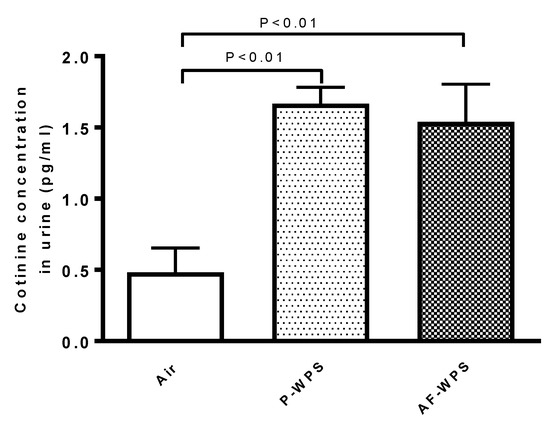 The quantification of urinary cotinine concentrations was performed using an ELISA kit purchased from Creative Diagnostics (Shirley, NY, USA). The latter was assessed following the final exposure session to P-WPS or AF-WPS or air on urine samples obtained overnight by means of metabolic cages.