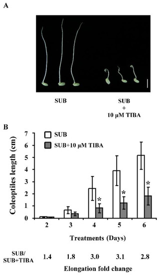 The effects of auxin polar transport inhibitor 2,3,5-triiodobenzoic acid (TIBA) on submerged rice coleoptiles. (A) Rice seeds after submergence (SUB) and submergence combined with 10 µM TIBA (SUB + TIBA) for five days. (B) Lengths of rice coleoptiles after SUB and SUB + TIBA treatment for 2–6 days. Bar = 1 cm. Data expressed as average values ± standard deviations from six biologically independent experiments. * p < 0.05 versus value in submergence treatment (Student’s t-test).
