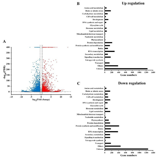 Differentially expressed genes (DEGs) exhibiting 1.5-fold changes and Benjamini–Hochberg adjusted P values (FDR) of < 0.01 were selected. The functions of DEGs were identified while using the Gene Ontology (GO) and Kyoto Encyclopedia of Genes and Genomes (KEGG) databases. GO functional enrichment analysis was performed using Blast2GO (version 2.3.5, BioBam, valencia, Spain) (http://www.blast2go.org/) [34]. The KEGG pathway analyses of the DEGs were performed using the public pathway database (https://www.genome.jp/kegg/pathway.html). Significant genes can be integrated with high-throughput data analysis to produce diverse overviews by using MapMan (http://MapMan.gabipd.org) [35]. The genes were mapped to the OS-Nipponbare-Osa-RAPDB reference genome and used to visualize the involvement of the DEGs in the pathways by using MapMan version 3.6.0RC1.