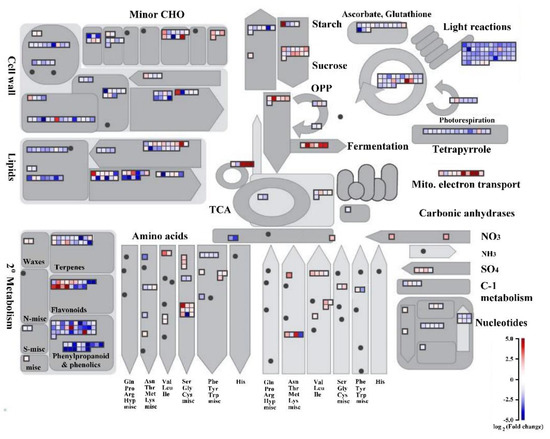 - Thimm, O.; Bläsing, O.; Gibon, Y.; Nagel, A.; Meyer, S.; Krüger, P.; Selbig, J.; Müller, L.A.; Rhee, S.Y.; Stitt, M. MAPMAN: A user-driven tool to display genomics data sets onto diagrams of metabolic pathways and other biological processes. Plant J. 2004, 37, 914–939. [Google Scholar] [CrossRef]