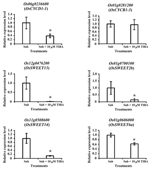 We confirmed the transcript levels of the development-responsive genes by using qRT-PCR. The transcript levels of OsCYCD1-1, OsSWEET13, OsSWEET2b, OsSWEET14, and OsSWEET6a were reduced. Only OsCYCD1-3 had no significant difference in SUB + TIBA treatment (Figure 4).