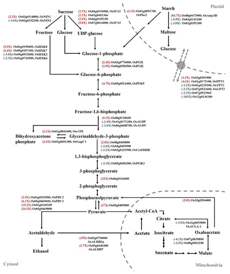 Differentially expressed genes involved in starch degradation, glycolysis, and fermentation pathways. Red text represents fold change (FC) and significant upregulation in SUB + TIBA treatment compared with SUB treatment. Blue text represents FC and significant downregulation. The qRT-PCR profile confirmed that the transcript levels of carbohydrate-metabolism–related genetic expression were similar to the RNA-Seq results. The transcript levels of amylase (Os08g0473900), sucrose synthase (Os07g0616800), hexokinase (Os05g0187100 and Os01g0190400), fructose-bisphosphate aldolase (Os08g0120600), phosphoenolpyruvate carboxykinase (Os10g0204400), lactic acid dehydrogenase (Os02g0730000), pyruvate decarboxylase (Os05g0469600), and phosphoenolpyruvate/phosphate translocator (Os01g0172100) were induced, and plastidic phosphate translocator (Os12g0136100), fructose-bisphosphate aldolase (Os11g0171300), and glyceraldehyde-3-phosphate dehydrogenase (Os03g0129300) were reduced under SUB + TIBA treatment (Figure 6). Our results indicate that auxin signaling is involved in energy production processes under submerged conditions. The red word showed upregulated genes, whereas the blue word showed downregulated genes.