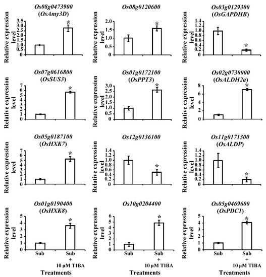 The coleoptiles submerged with TIBA were shorter and curlier than those that were submerged without TIBA (Figure 1). Therefore, we analyzed the transcript levels of development-responsive genes in submerged coleoptiles. Two genes were associated with cell division: Os01g0281200 encoding G2/mitotic-specific cyclin-B1-3 (OsCYCB1-3) and Os06g0236600 encoding G1/S-specific cyclin-D1-1 (OsCYCD1-1). Both of the cell-division-related genes were downregulated when submerged with TIBA. In addition, three genes were associated with vascular auxin transport (walls are thin 1, WAT1), which is involved in regulating intracellular auxin homeostasis in plants. The transcript levels of Os01g0803300, Os04g0422300, and Os06g021000 were significantly downregulated in SUB + TIBA treatment. Furthermore, most sugar transport genes, such as Os01g0606000 (OsSWEET6a), Os12g0476200 (OsSWEET13), Os11g0508600 (OsSWEET14), and Os01g0700100 (OsSWEET2b), were downregulated in SUB + TIBA treatment (Table 3).