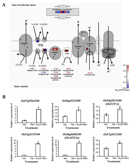 Transcript levels of mitochondrial-electron-transport–associated genes regulated by auxin signaling in submerged coleoptiles. (A) The differentially expressed genes of mitochondrial electron transport in the SUB and SUB + TIBA treatments in coleoptiles were illustrated using MapMan. The log2 fold change color scale ranges from −5 to 5. Red and blue squares represent up- or down-regulated response, respectively, in coleoptiles submerged with 10 μM TIBA compared with those submerged without TIBA treatment. (B) Relative expression levels of mitochondrial-electron-transport–associated genes were determined using a quantitative real-time polymerase chain reaction. Total RNA was isolated from the coleoptiles after 5 days of submergence treatment with or without 10 µM TIBA. The expression levels of Os04g0182800, Os02g0318100, Os07g0564500, Os03g0835400 (OsETFA), Os04g0600200 (OsAOX1a), and Os07g0621600 were determined. These genes were calculated and normalized with ubiquitin gene (Os02g0634800) as an internal standard. The red word showed upregulated genes, whereas the blue word showed downregulated genes. The values are presented as mean ± standard deviation based on 30 coleoptiles for each treatment obtained from six biologically independent experiments. * p < 0.05 versus the submergence treatment value (Student’s t-test).