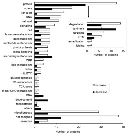 To determine the functional role of these proteins, functional categorization was performed using MapMan bin codes. The majority of the significantly changed proteins in the soybean root, treated with silver NPs mixed with nicotinic acid and KNO3 compared to control, were related to protein (60 proteins), stress (25 proteins), transport (14 proteins), RNA (19 proteins), and cell wall (12 proteins) (Figure 2). The differentially changed proteins related to the protein category were further divided into sub-categories. This sub-categorization revealed that more proteins related to proteins degradation were significantly changed; out of which, the abundance of 14 and 6 proteins was increased and decreased, respectively. Among the identified protein degradation-related proteins, RRM domain-containing protein was accumulated at a higher degree than the proteasome subunit alpha and ubiquitin conjugating two domain-containing proteins (Supplemental Table S1). The second most changed proteins related to protein category were related to protein synthesis. In total, 18 protein synthesis-related proteins were identified; out of which, the abundance of 12 and 6 proteins was decreased and increased, respectively (Figure 2).