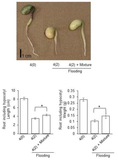 Effects of flooding stress with silver NPs/nicotinic acid/KNO3 on the morphology of soybean seedlings. Two-day-old soybeans were flooded with or without 5 ppm silver NPs/8 µM nicotinic acid /0.1mM KNO3. After treatments, length and weight of root including hypocotyl were measured at two days of stress. Data are presented as the mean ± S.D. from three independent biological replicates. Significance was calculated using Student’s t test (* p < 0.05). Scale bar indicates 1 cm.
