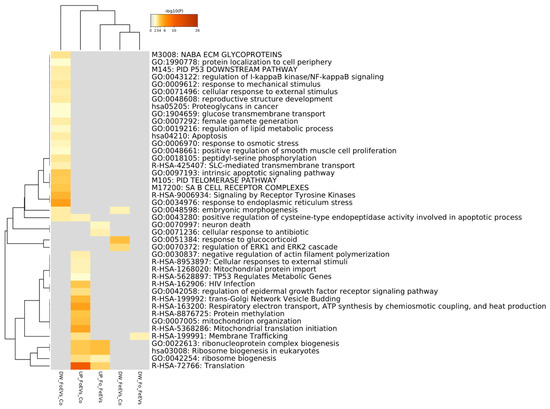 In Figure 3, a Metascape heatmap plot represents the functional enrichment analysis for up- and downregulated genes in embryos treated with frozen or fresh EVs compared to control and between EV treatments, and shows clusters of enriched functional terms across DEGs from different comparisons. The heatmap illustrates that functional terms and pathways related to “embryo morphogenesis” were only enriched for genes downregulated in FoEV treatment vs. Co and FeEV treatment vs. Co sets. Furthermore, genes downregulated in FoEV treatment vs. Co were also enriched for biological processes related to “female gamete generation”, “apoptosis”, “response to external stimulus”, “response to osmotic stress”, “telomerase pathway”, “glucose transmembrane transport”, and “regulation of lipid metabolic process”. For the upregulated genes in the FoEV treatment vs. Co comparison, we found high enrichment of “translation” and also of functional terms involved in “ribosome biogenesis”, “membrane trafficking”, “mitochondrial organization”, and “protein methylation”. Additionally, FoEV treatment vs. Co upregulated genes were involved in “negative regulation of actin filament polymerization”. When both EV treatments were compared, the GO terms found to be enriched were “translation”, “ribonucleoprotein complex biogenesis”, and “ribosome biogenesis” for upregulated genes, and “membrane trafficking” for downregulated genes in the FoEV treatment vs. FeEV treatment comparison.
