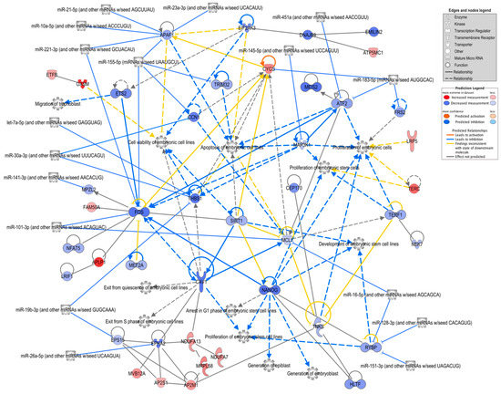 The analysis of the DEG lists performed with IPA software (gene expression core analysis) revealed basically similar results, i.e., similar overrepresented functional terms and pathways as were obtained with Metascape. Thus, the analysis was focused on genes related to embryonic development by searching for all enriched related functions and generating a network of the associated genes, including 17 miRNAs potentially targeting the genes in the network and previously identified in bovine oEVs [19] (Figure 4; Supplementary Data S2(Tables S9 and S10)). Overall, the majority of the assigned genes had lower mRNA levels in the embryos supplemented with frozen oEVs. The genes with the highest connectivity were Nanog homeobox (NANOG), MCL1 apoptosis regulator, BCL2 family member (MCL1), Fos proto-oncogene, AP-1 transcription factor subunit (FOS), activating transcription factor 2 (ATF2), apoptotic peptidase activating factor 1 (APAF1), cytochrome c, somatic (CYCS), and thrombospondin 1 (THBS1). The processes with the highest connectivity were “apoptosis of embryonic cell lines”, “proliferation of embryonic cells”, and “cell viability of embryonic cell lines”. The genes targeted by the highest number of miRNAs were APAF1 (five miRNAs), FOS (three miRNAs), THBS1 (three miRNAs), and RING1 and YY1 binding protein (RYBP, three miRNAs).