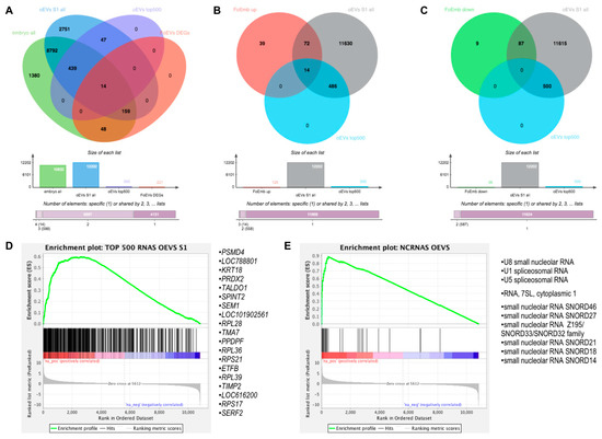 Comparative analysis of embryonic mRNAs altered under oEV treatment and oEV-derived mRNAs and ncRNAs. (A) Venn diagrams representing the comparison among all identified mRNAs in embryos, upregulated DEGs in embryos supplemented with frozen EVs (FoEVs) compared to control embryos, all mRNAs in oviductal EVs (oEVs), and top 500 most abundant mRNAs in oEVs; (B) comparison among upregulated DEGs in FoEV treatment vs. Co, all mRNAs in oEVs, and the top 500 most abundant mRNAs in oEVs; (C) comparison among downregulated DEGs in DEGs in FoEV-treated vs. Co embryos, all mRNAs in oEVs, and the top 500 most abundant mRNAs in oEVs; (D) gene set enrichment analysis (GSEA) showing enrichment of the top 500 most abundant mRNAs in oEVs in the rank list of all genes detectable in embryos supplemented with frozen oviductal EVs (oEVs) ranked by differential expression (red = higher expression in FoEVs-treated embryos compared to control embryos, blue = lower expression), and the 19 genes with the highest enrichment scores; (E) GSEA enrichment plot showing enrichment of oEVs-derived non-coding RNAs (ncRNAs) in the rank list (same list as in D), and the 10 ncRNAs with the highest enrichment scores.