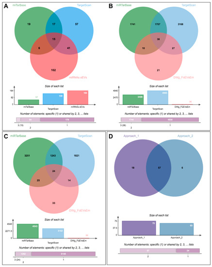 Identification of potential miRNAs in oviductal EVs responsible for downregulation of embryo gene expression using two different approaches: (1) From identified downregulated genes in embryos to potential miRNAs in oEVs and (2) From identified miRNAs in oEVs to potential target genes in embryos. (A) Venn diagram representing the comparison among potential miRNAs targeting identified downregulated genes in embryos using miTarBase and TargetScan databases and identified miRNAs in oEVs; (B) Venn diagram representing the comparison of potential target genes of the miRNAs derived from the previous comparison and identified downregulated genes in embryos; (C) Venn diagram representing the comparison among potential target genes derived from identified miRNAs in oEVs using miTarBase and TargetScan databases and identified downregulated genes in embryos; (D) comparison of lists of target genes from both approaches.