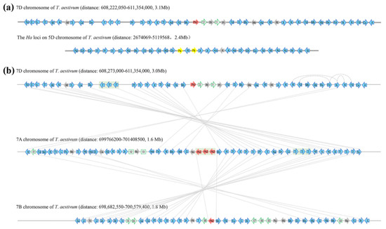 Syntenic alignments of bread wheat chromosomal segments that contains Pinb2-7D locus at 7DL and Ha locus at 5DS (a), and those that contains Pinb2-7D, Pinb2-7A, Pinb2-B at 7DL, 7AL and 7BL, respectively (b). Wheat chromosomes are represented as grey horizontal lines, whereas genes along the chromosome are represented as arrowheads. Pina-D1 and Pinb-D1 are represented as yellow arrowheads. Pinb2 are represented as red arrowheads, while the other protein-coding genes with high confidence annotations in the IWGSC RefSeq v1.0 bread wheat genome are represented as blue arrowheads. Homoeologous gene pairs are indicated as dotted lines connecting arrowheads. Tandem duplication of the three Pinb2-7A genes is shaded in the grey box. To simplify visualization, only high-confidence protein-coding genes are shown with their orders and orientations along the chromosomal segments, shown as the same in wheat genome assembly. The intergenic regions are not in proportion to the wheat genome assembly. For visualization, only abbreviations of the genes are labeled on the arrowheads, with their full names provided in Table S3.