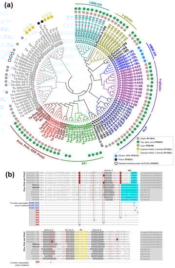 While there is a lack of synteny between the genomic segments harboring Pinb2 and the Pina/Pinb genes, the Pinb2 genes indeed have a high sequence similarity with Pinb, indicating that Pinb2 might have the sequence basis for kernel hardness or interactions with other seed proteins. Therefore, we analyzed its phylogeny together with other seed proteins, many of which belong to the prolamin superfamily [48]. The phylogenetic results separated wheat globulins and albumins from those in the prolamin superfamily (Figure 2a, Table S4). PINB2 proteins were clustered together with PINA, PINB and GSP. The puroindoline cluster was grouped together with a cluster largely consisting of α-amylase inhibitors (ATIs). As the repetitive sequences exist in many proteins of the prolamin superfamily and could be problematic for sequence alignment or annotation, we therefore used the domain signatures and conserved cysteine residue patterns to help define the phylogenetic clusters of wheat seed proteins. The results showed that almost all the phylogenetically analyzed prolamin proteins, including PINB2, have Gliadin and Tryp_alpha_amyl domains (PF13016 and PF00234, respectively) except that the α-amylase inhibitors only contain domain PF00234 and high-molecular-weight glutenin subunits (HMW-GSs) contain the HMW domain (PF03157). In addition, the conserved cysteine-rich patterns and number of cysteine residuals can be used as characteristics for defining groups of storage proteins within the prolamin superfamily [43]. For example, HMW-glutenin x- and y-type subunits contain four to six cysteines, while α-gliadin and γ-gliadin have six to eight and eight to eleven cysteines, respectively (Figure S4). Type a-, b- and c- avenin-like proteins (ALPs) have 14, 18–20, and 10–12 cysteine residues, respectively, and some ALPs have effects on dough quality, likely due to the number of cysteine residues for interaction with wheat storage proteins (Figure S4) [49,50,51,52]. Here, PINB2 identified in the bread wheat genome of CS shares the same cysteine-rich backbone consisting of 10 residues as PINA, PINB, and GSP (Figure S4).
