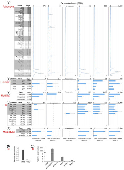 Expression patterns of Pinb2 genes. Expression levels of Pinb2 genes and Pinb-D1 from five publicly available RNA-seq datasets and shown in bar charts (a–e). The varieties used for RNA-seq analyses are indicated in red, while the tissues, developmental stages and conditions for each RNA-seq experiments are labeled on the left of each panel. Expression levels are shown using TPM and are not normalized across datasets. (f) The relative expression levels of Pinb and Pinb2 genes were quantified using qRT-PCR at 28 Days Post Anthesis (DPA) in CS seeds. (g) Expression levels of Pinb2 genes in different tissues from CS proved Pinb2 genes are expressed specific in seeds. Detailed information of the RNA-seq datasets used are given in Table S5.